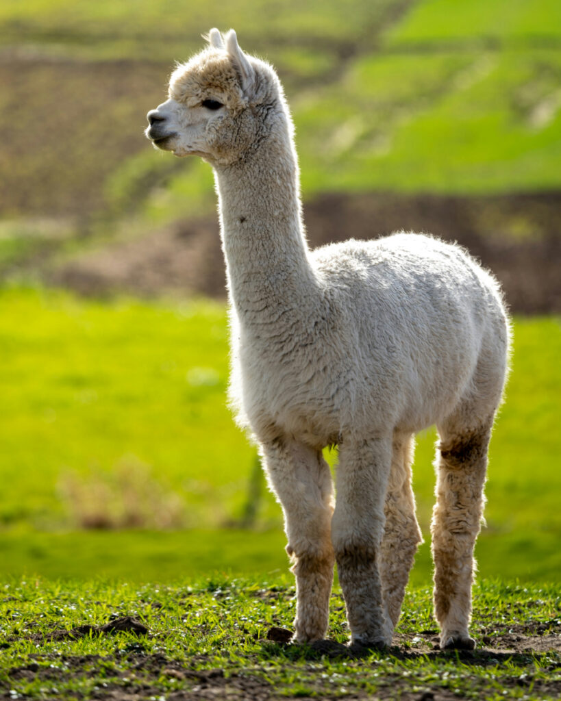 Alpacas (Vicugna pacos) are domesticated South American camelids descended from the wild vicuña. They are herd-oriented herbivores adapted to high-altitude grassland ecosystems, particularly in the Andes.